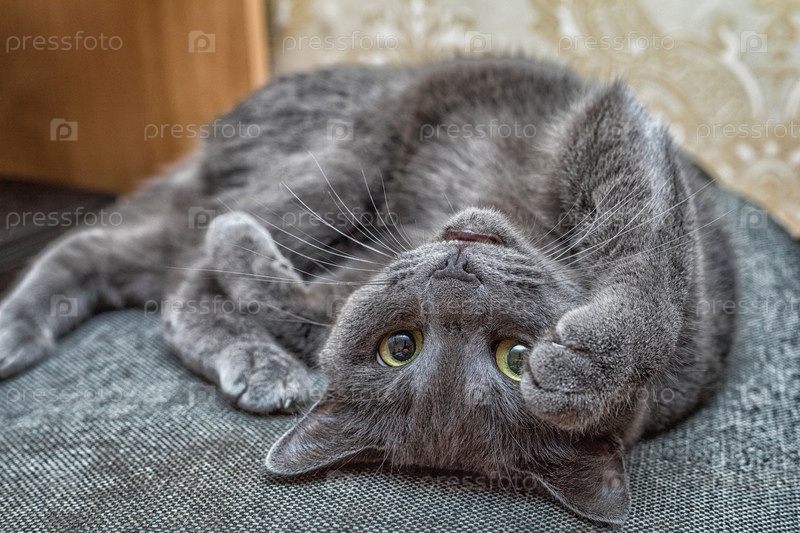 Русский голубой кот лежит на спине