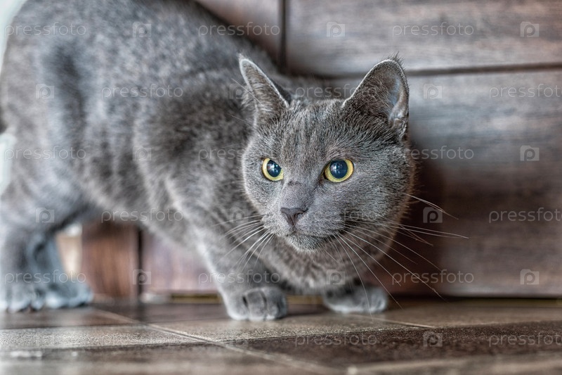 Русский голубой кот готов прыгать