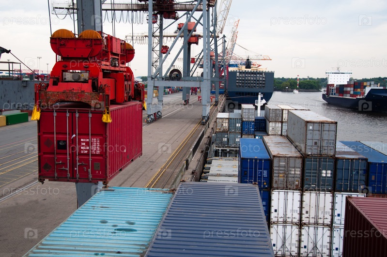 Погрузка или разгрузка большим грузовым краном на контейнеровозе в гавани