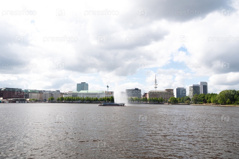 Круизное судно и фонтан в Иннер Альстер (Бинненальстер) в Гамбурге, Германия