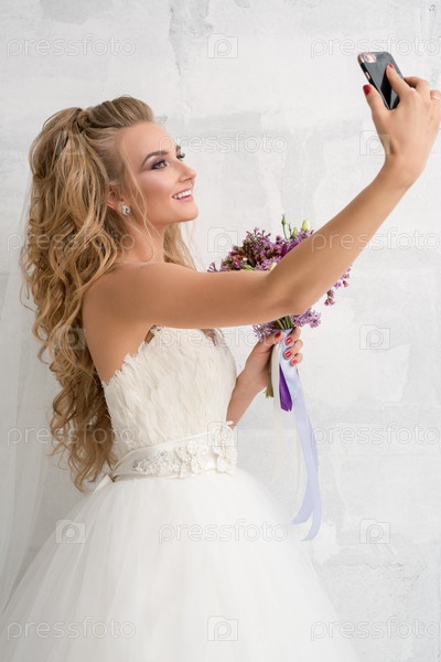 Молодая невеста с букетом делает селфи
