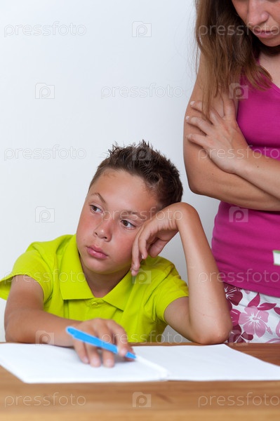 Грустная женщина делает домашнее задание с ее сыном
