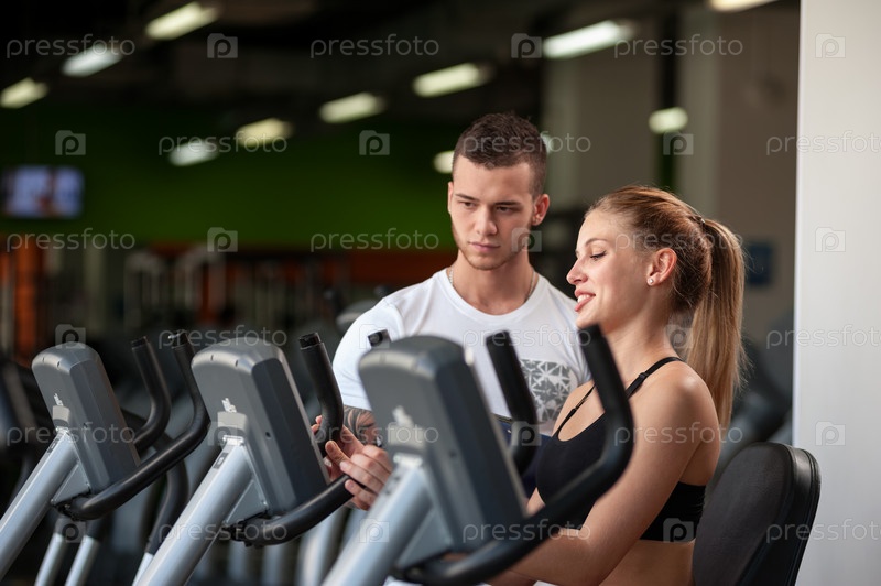 Молодые тренер с клиенткой в тренажерном зале