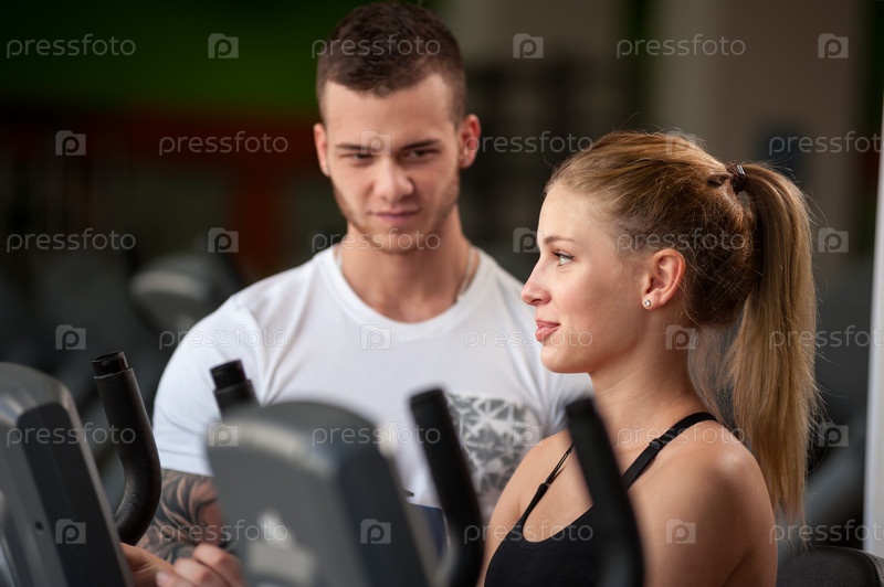 Персональный тренер помогает его клиентке в тренажерном зале