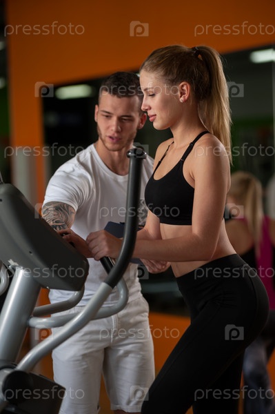 Персональный тренер помогает его клиентке в тренажерном зале