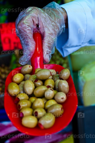 Рука в перчатке с зелеными оливками на египетском рынке (MisirCarsisi) в Стамбуле, Турция