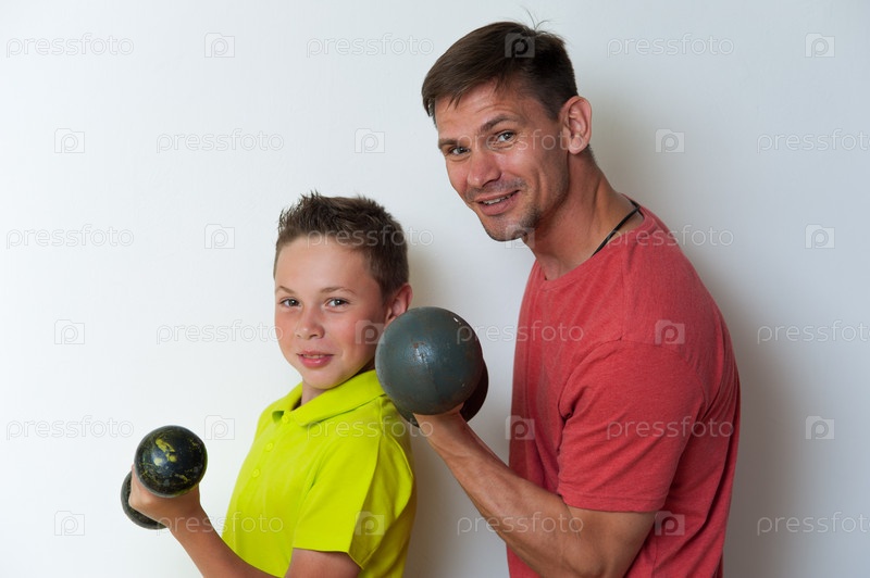 Отец и сын с гантелями