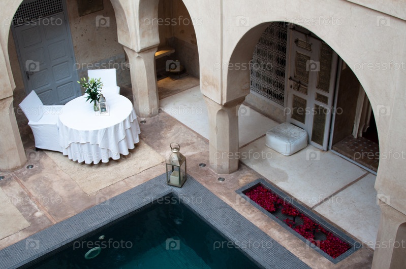 Отель с бассейном и обеденныйм столом в Медине, Марракеш, Марокко