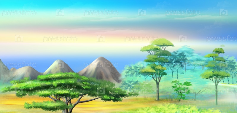 Пейзаж с акацией в горах на рассвете