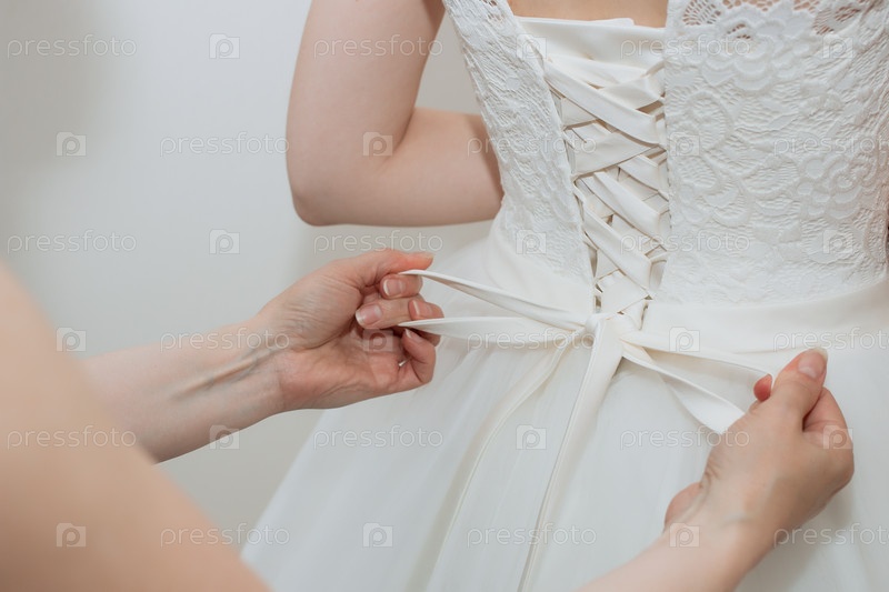 Мама помогает дочери надеть свадебное платье