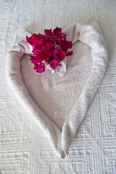 Украшение из полотенца и цветов на кровати в отеле