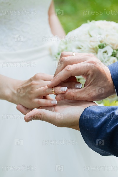Жених надевает кольцо на руку невесты