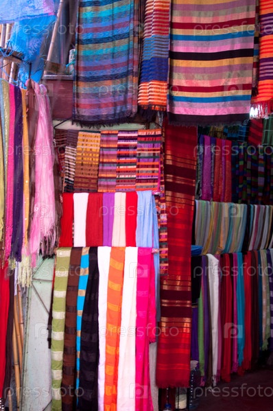Разнообразные шарфы в магазине в Медине в Марракеше, Марокко