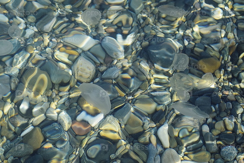 Медузы в море на фоне камней