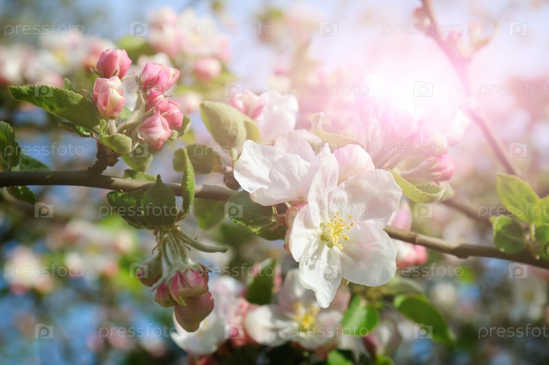 Цветы яблони в лучах яркого солнца