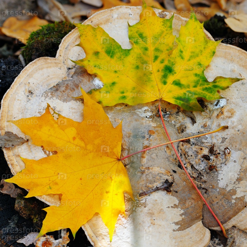 Осенние листья клена на старом пне в лесу