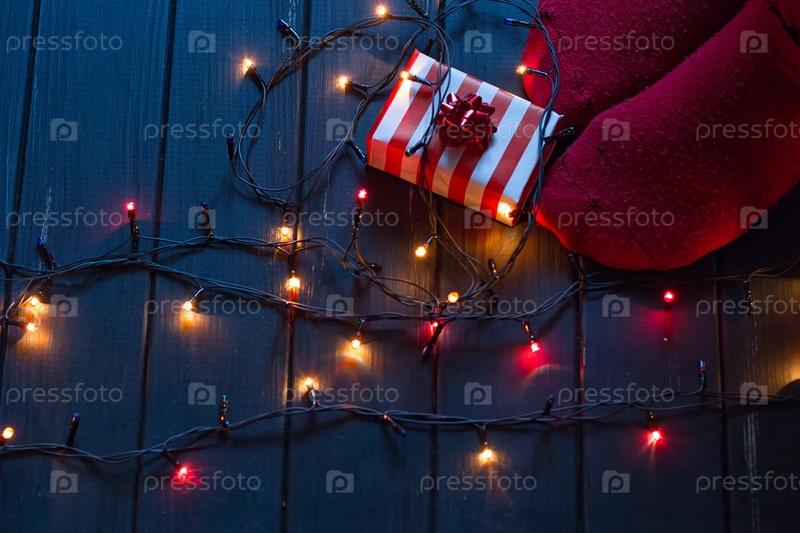 Женщина ноги в шерстяных носках с огнями гирлянды