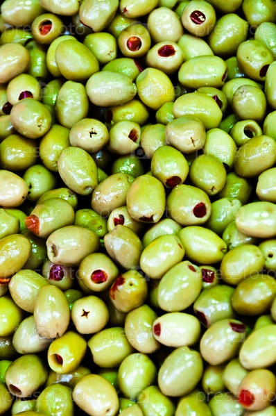 Наполненные зеленые оливки в Египте на рынке (MisirCarsisi) в Стамбуле, Турция