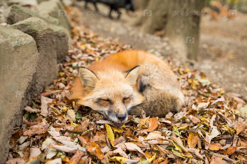Лиса спит с осенними листьями