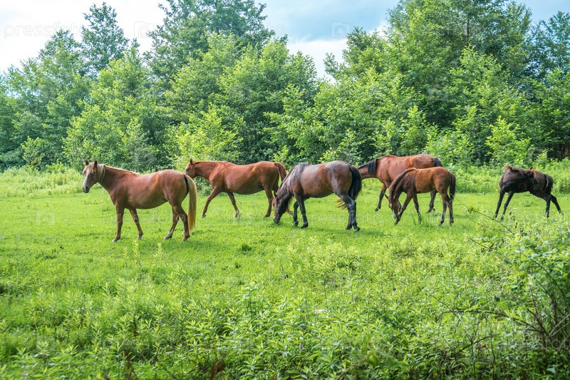 Коричневые лошади на пастбище