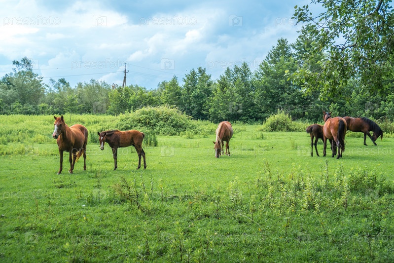 Коричневые лошади пасутся на пастбище