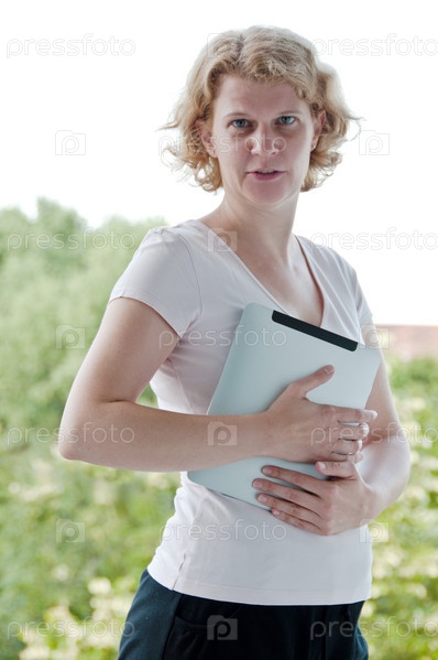 Женщина на природе с планшетным компьютером