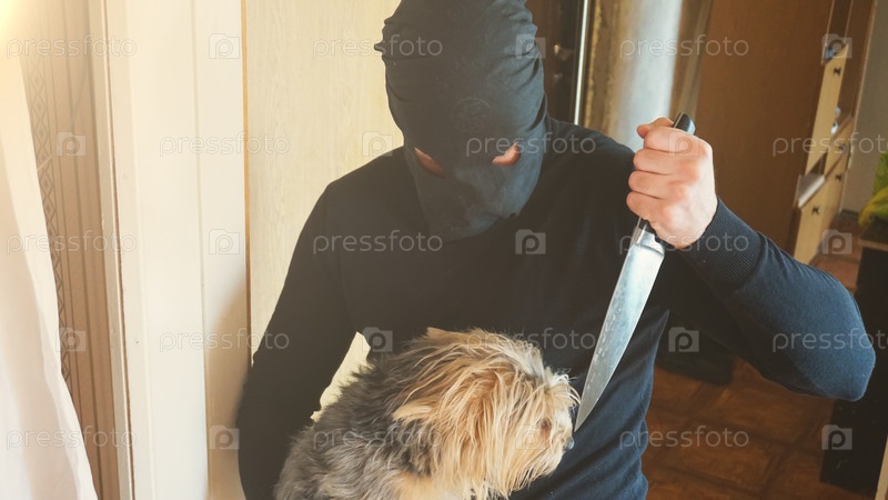 Вор в маске с ножом хочет убить собаку
