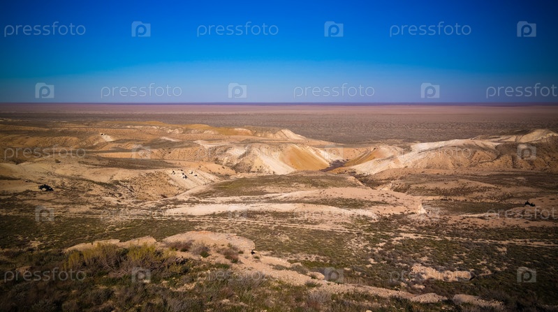 Аральское море от края плато Устюрта на закате в Каракалпакстане, Узбекистан