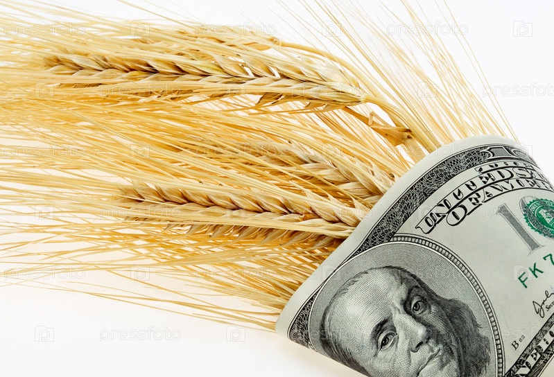 Колосья пшеницы, завернутые в доллары, на светлом фоне