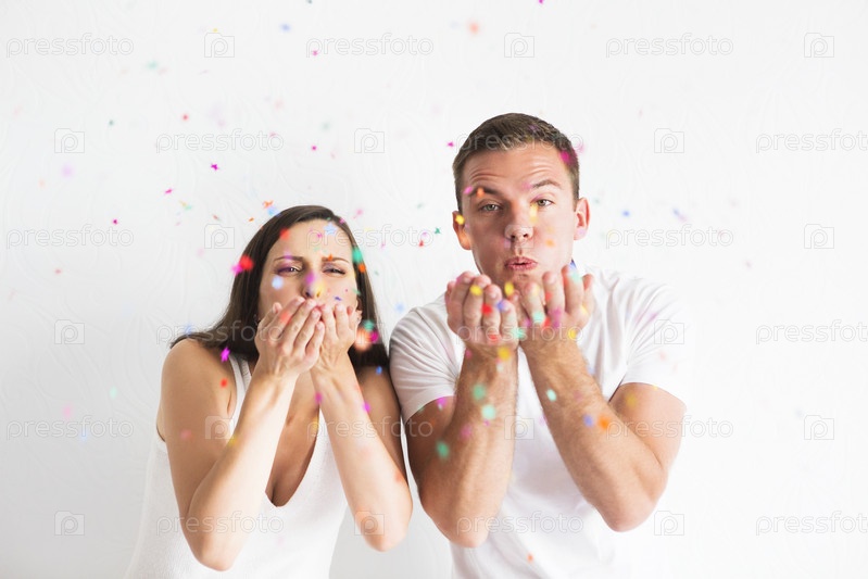Молодой человек и женщина дуют конфетти