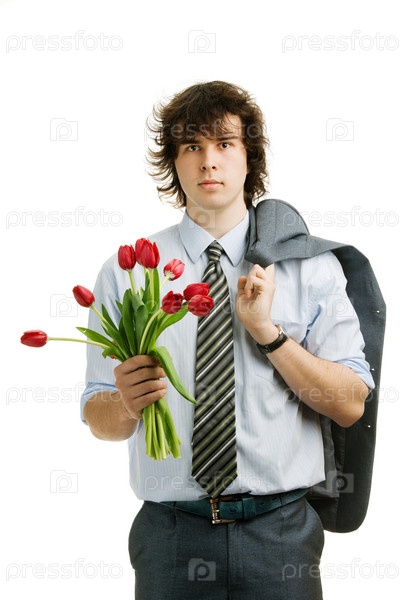 Молодой человек с красными тюльпанами в руке