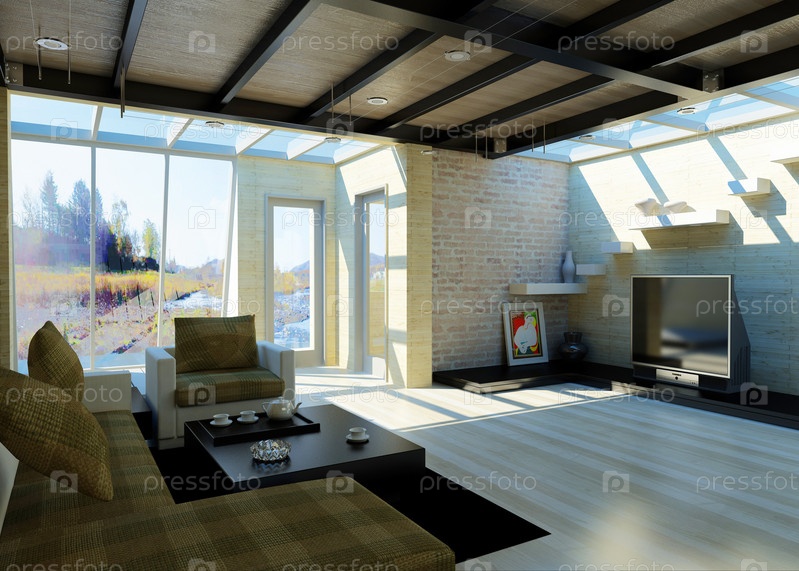 Современная гостиная с большими окнами