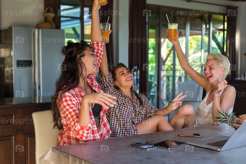 Три веселые девушки в кафе