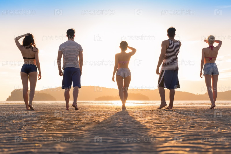 Молодые люди на пляже на закате