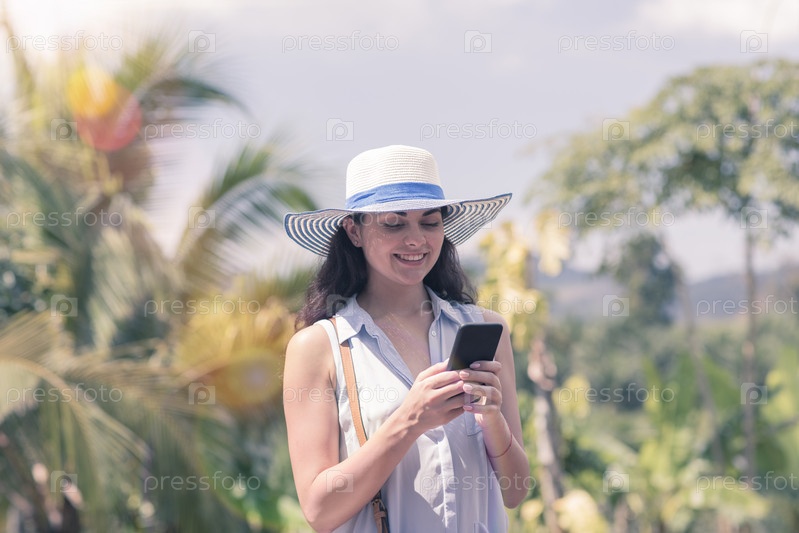 Привлекательная женщина в шляпе со смартфоном