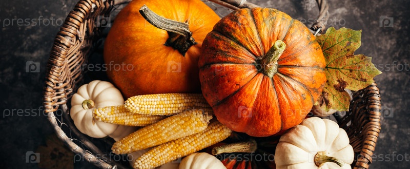 Тыквы и кукуруза в корзине