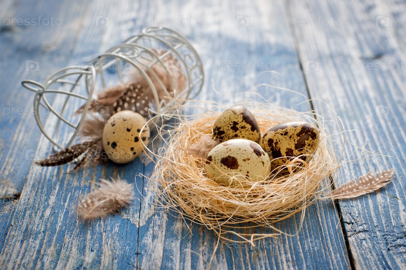 Перепелиные яйца на синем фоне