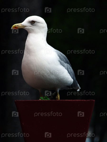 Чайка сидит на цветочном горшке