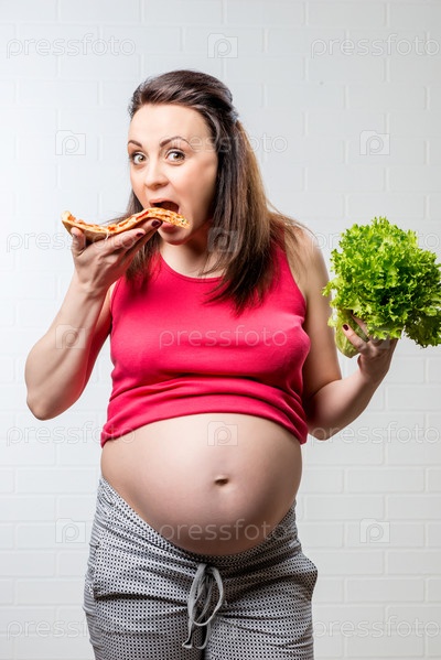 Голодная беременная женщина выбирает нездоровую пищу