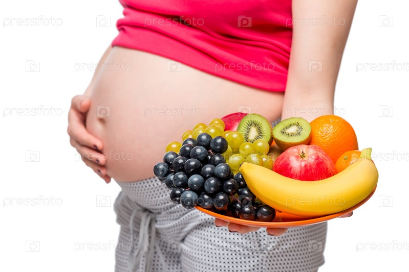 Тарелка фруктов на фоне живота беременной женщины крупным планом