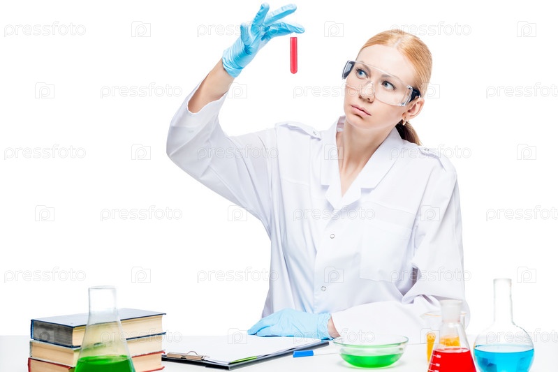 Лаборант с красной жидкостью в пробирке делает эксперименты