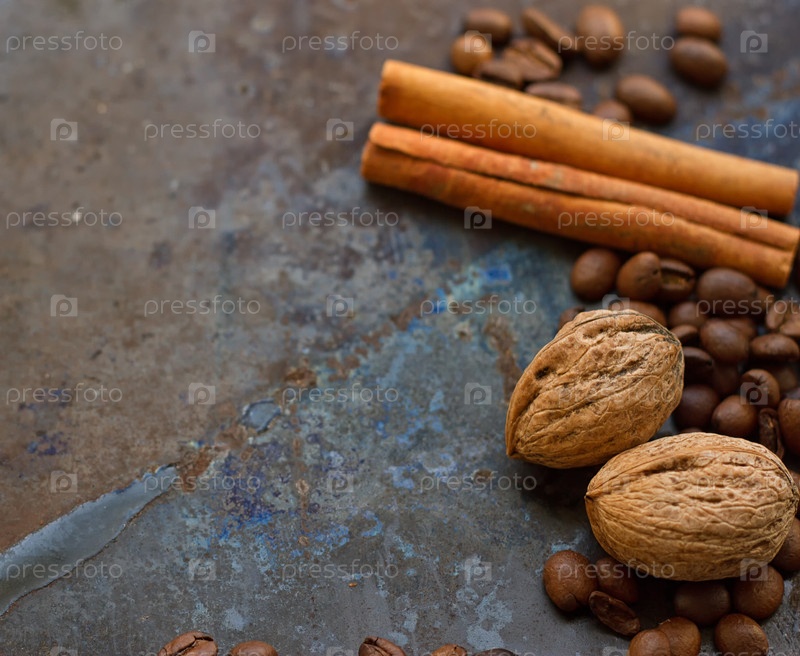 Кофейные зерна, орехи и палочки корицы