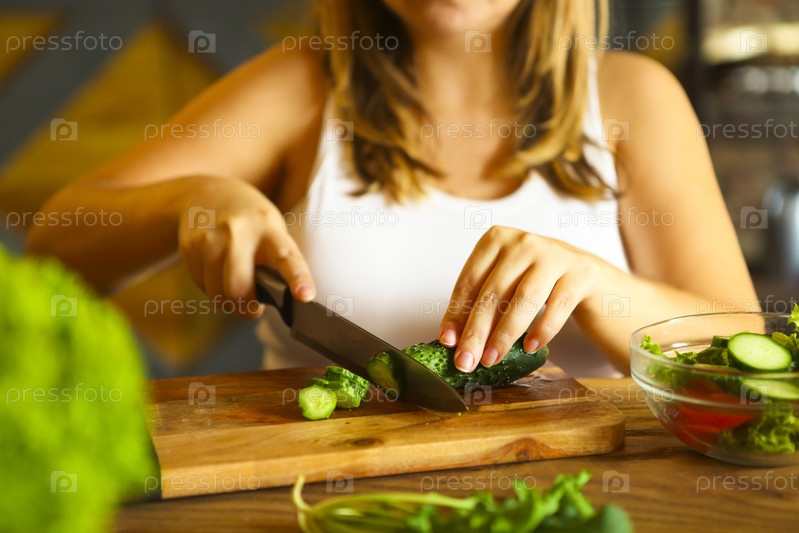 Молодая женщина делает овощной салат