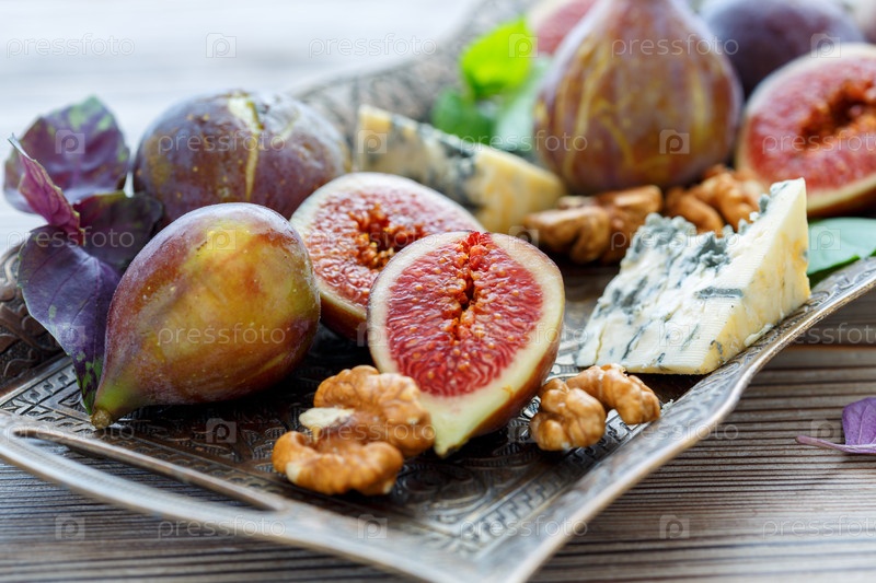 Грецкие орехи, спелые фиги и голубой сыр на подносе