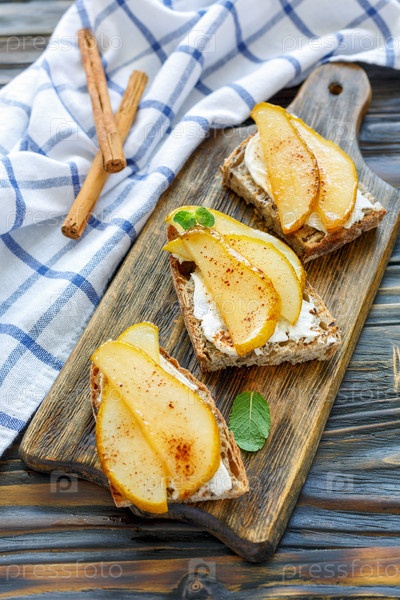Кростини с рикоттой и груши на деревянной доске