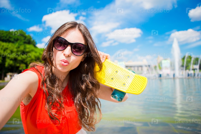 Молодая девушка со скейтбордом в парке