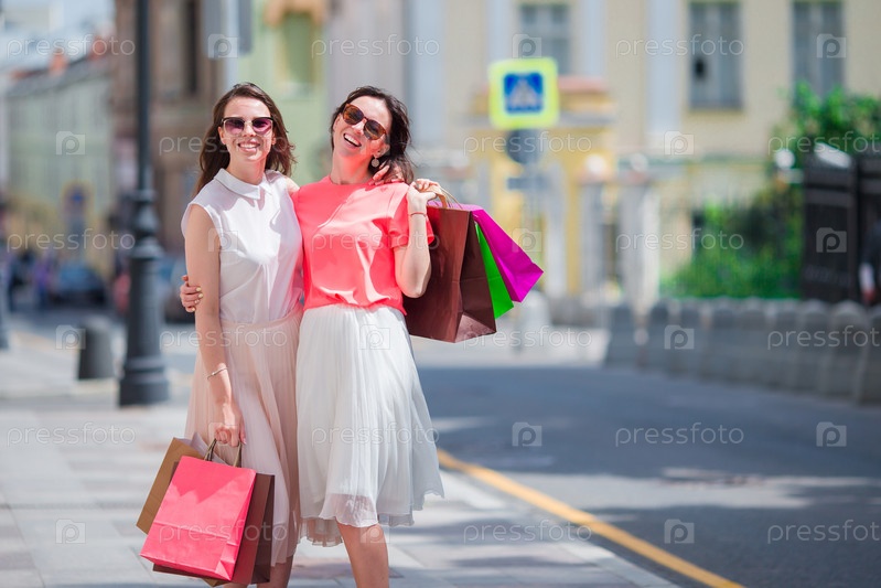 Счастливые молодые женщины с сумками