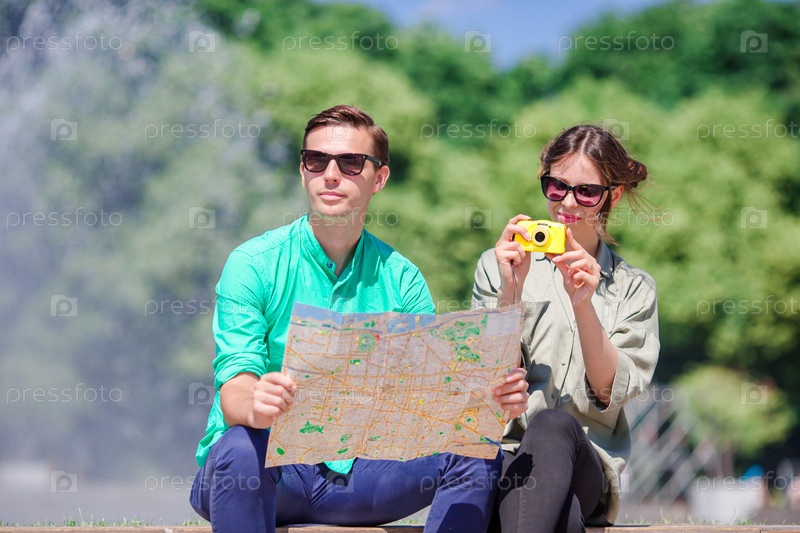 Молодые туристы с картой города в поисках достопримечательностей