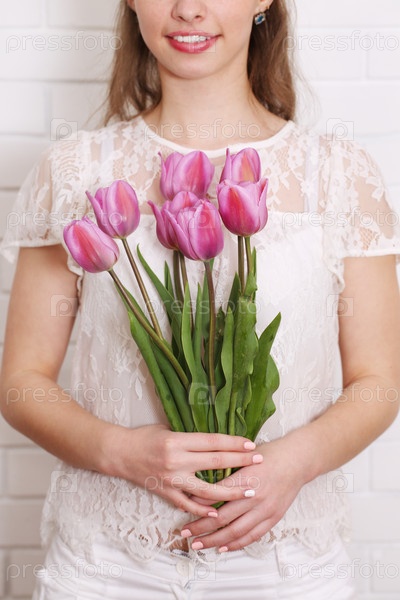 Фиолетовые тюльпаны в руках женщины