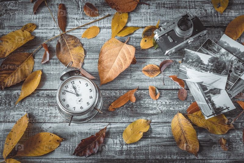 Осенние листья, будильник и камера